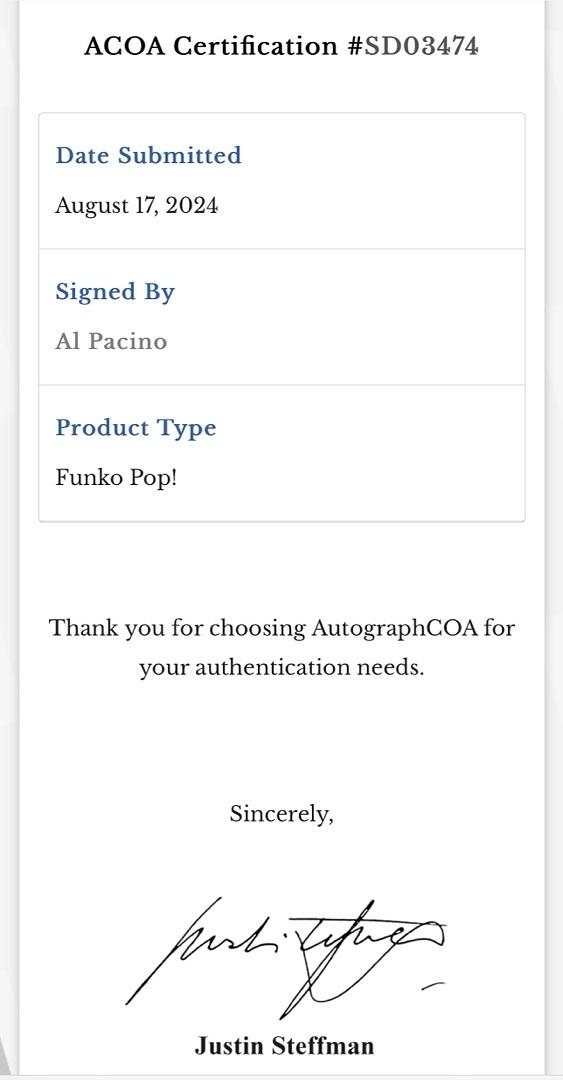 Celebrate cinematic history with this Al Pacino signed Funko Pop #390 featuring Michael Corleone from The Godfather. Authenticated by ACOA Hollywood Legend, this collectible offers a genuine autograph from the legendary actor. Perfect for fans and collectors, it captures the iconic character’s intensity while adding exceptional value and rarity to your collection. Don’t miss the chance to own this exclusive piece of film legacy.