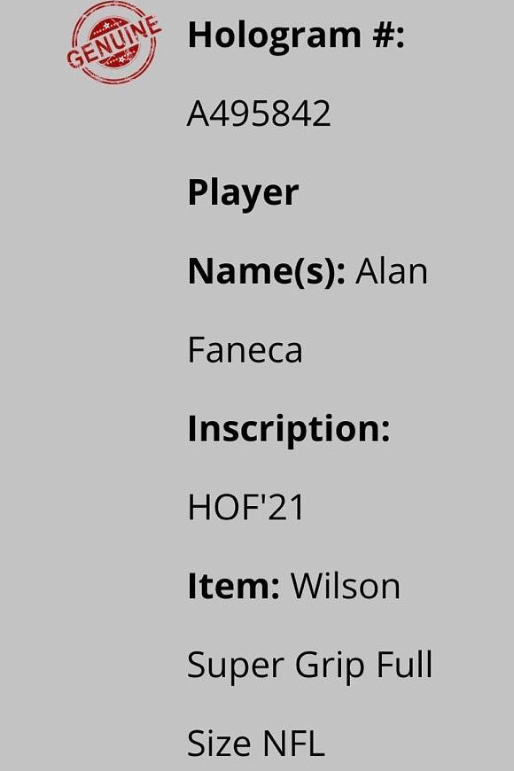 Celebrate the outstanding career of Alan Faneca with this signed replica football featuring his Hall of Fame inscription. Accompanied by a Schwartz Certificate of Authenticity, this collectible honors Faneca’s legacy as one of the game’s elite offensive linemen. A must-have for dedicated fans and collectors seeking a unique piece of football history.