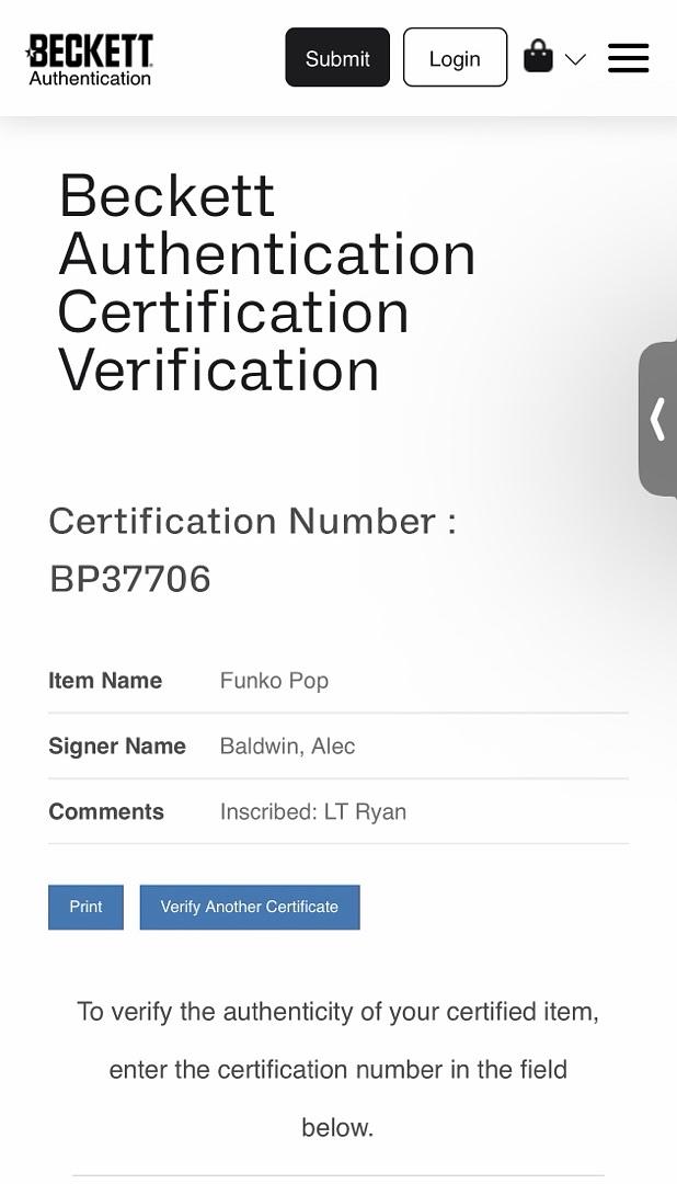 Alec Baldwin's autographed U.S. Marines Funko Pop stands as an exceptional collector's piece, authenticated by Beckett's Certificate of Authenticity. This EXCEEDINGLY rare Funko features an EXCEEDINGLY rare signature personalized "Lt. Ryan" inscription, making it a one-of-a-kind tribute to Mr. Baldwin's role in the iconic movie, "The Hunt for Red October." The combination of Baldwin's signature, the USMC theme, and Beckett's verification creates significant value for serious autograph and pop culture enthusiasts. A truly scarce find that belongs in any distinguished collection.