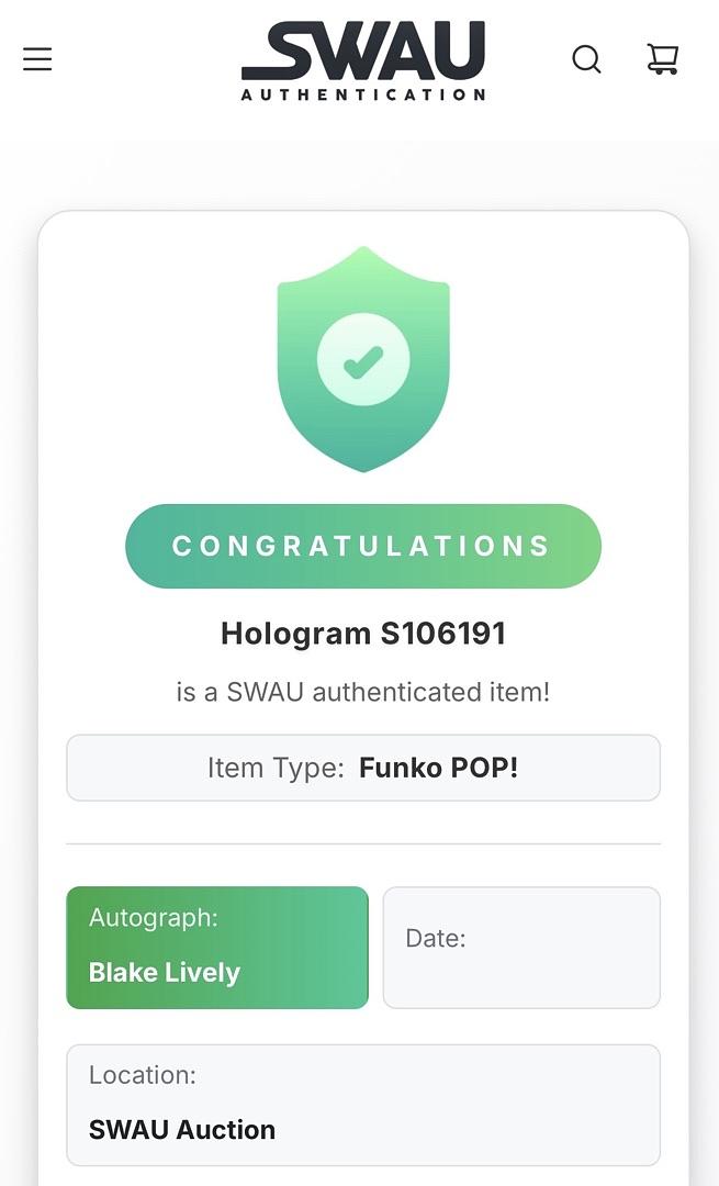 Add a unique collectible to your Funko Pop collection with this Blake Lively signed Funko Pop #1404 featuring Deadpool. Authenticated with an SWAU certificate, this exclusive signed piece is perfect for fans and collectors seeking genuine memorabilia. Don’t miss the chance to own this rare and striking autograph that celebrates Blake Lively’s connection to the iconic character.