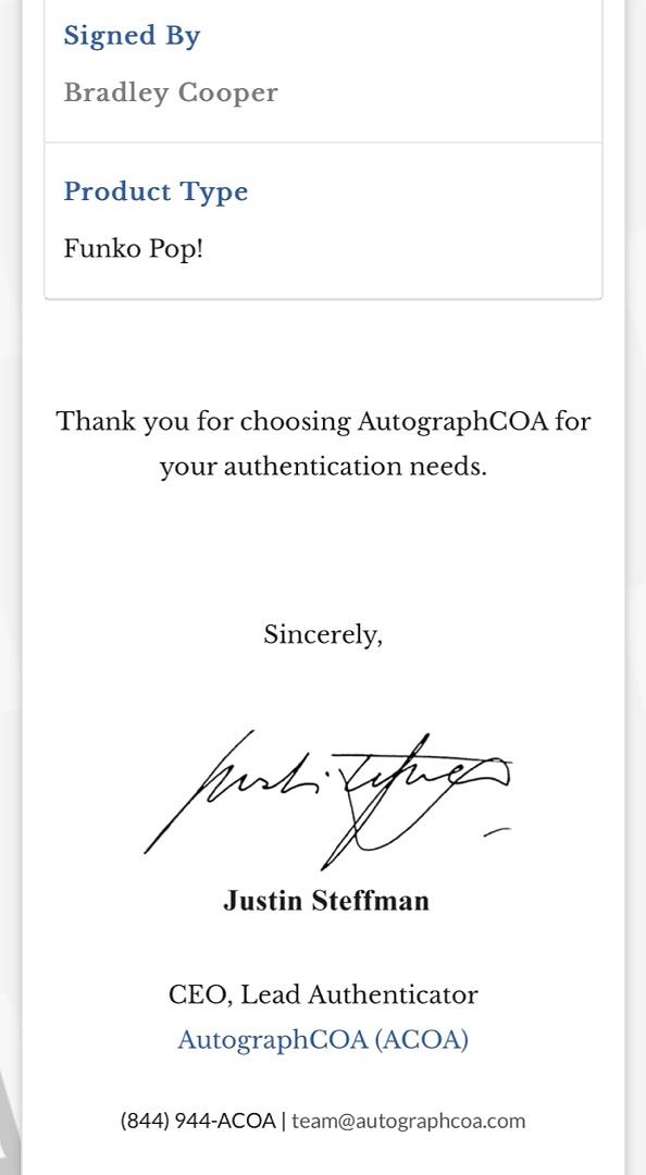 Enhance your Guardians of the Galaxy collection with this Bradley Cooper signed Funko Pop #1211 "Rocket Raccoon." Certified authentic by ACOA, this collectible captures the character’s spirited personality, making it a must-have for fans and collectors seeking a genuine and valuable addition to their display.