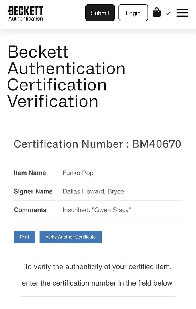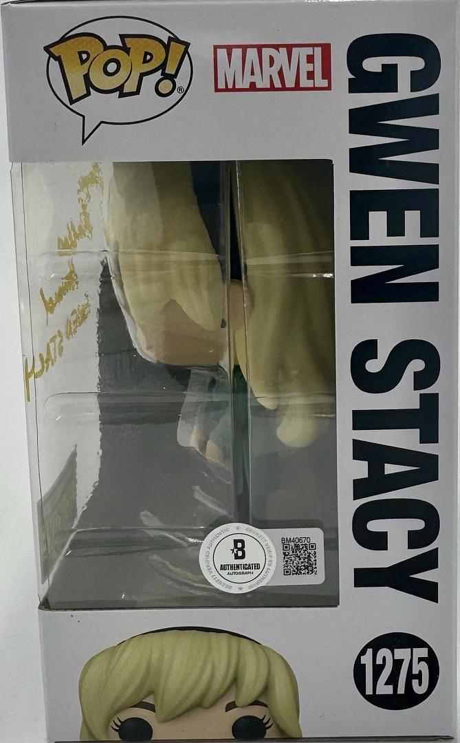 Enhance your Spider-Man collection with this Bryce Dallas Howard signed Funko Pop #1275 featuring Gwen Stacy. Certified authentic by Beckett, this collectible combines a beloved character with a genuine autograph, making it a must-have for fans and collectors. Celebrate Bryce Dallas Howard’s iconic role and add a unique, valuable piece to your display. Don’t miss the opportunity to own this exclusive signed Funko Pop.
