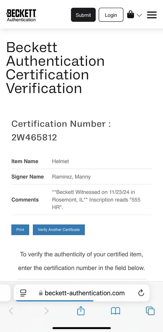 Celebrate Manny Ramirez’s incredible career with this full-size batting helmet, signed and inscribed with his 555 home runs. Featuring a Beckett Certificate of Authenticity and representing his time with Cleveland, this collectible is a must-have for passionate fans and serious collectors alike.