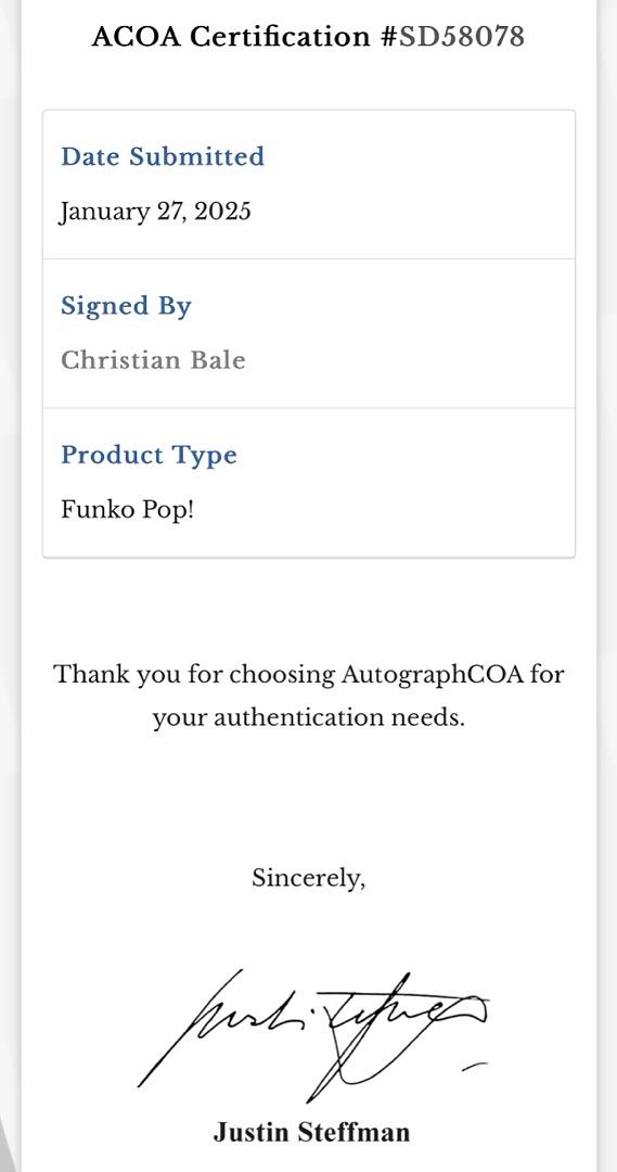 Own a striking collectible with this Christian Bale signed Funko Pop #1043 "Gorr" from Thor: Love & Thunder. Authenticated by ACOA, this piece features a genuine autograph that adds exceptional value. Perfect for fans and collectors, it’s a rare and special addition celebrating one of the most compelling characters in the Marvel universe. Don’t miss the chance to own this exclusive and authenticated treasure.