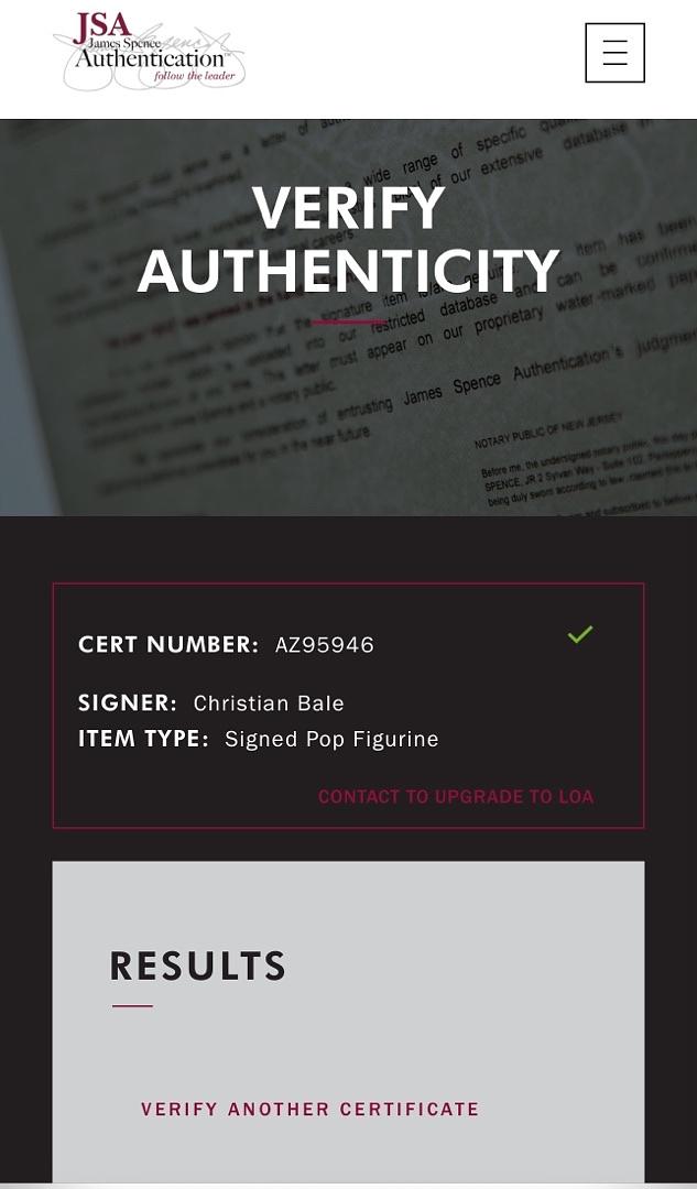 Own a stunning collectible with this Christian Bale signed Funko Pop #518 "Batman." Authenticated by JSA with a Certificate of Authenticity, this piece features a genuine autograph that adds exceptional value. Perfect for fans and collectors, it’s a rare and special addition celebrating one of the most iconic portrayals of the Dark Knight. Don’t miss the chance to own this exclusive and authenticated treasure.
