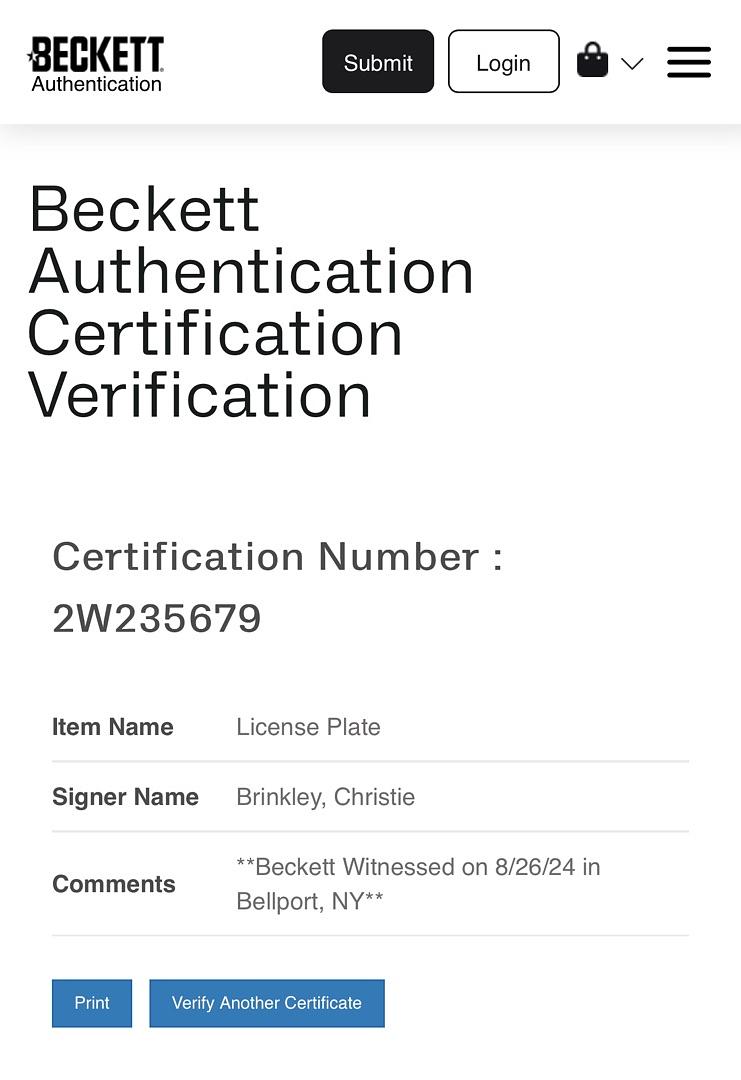 Own a unique piece of movie memorabilia with the Christie Brinkley Signed License Plate from National Lampoon’s Vacation, authenticated by Beckett COA. This rare collectible features Brinkley’s genuine signature, making it a standout addition for fans and collectors alike. Perfect for display, it offers verified authenticity and a direct connection to a beloved classic film. Don’t miss the chance to add this exclusive item to your collection.