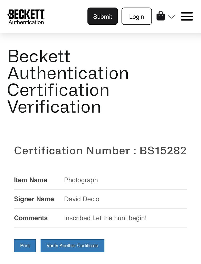 This 8x10 photo signed by David Decio, known for his role in the Harry Potter series, is authenticated with a Beckett Certificate of Authenticity. A rare addition for collectors of Harry Potter memorabilia, it offers verified provenance and a tangible connection to the beloved franchise. Ideal for display or investment, this signed photo enhances any collection with its authenticity and significance.