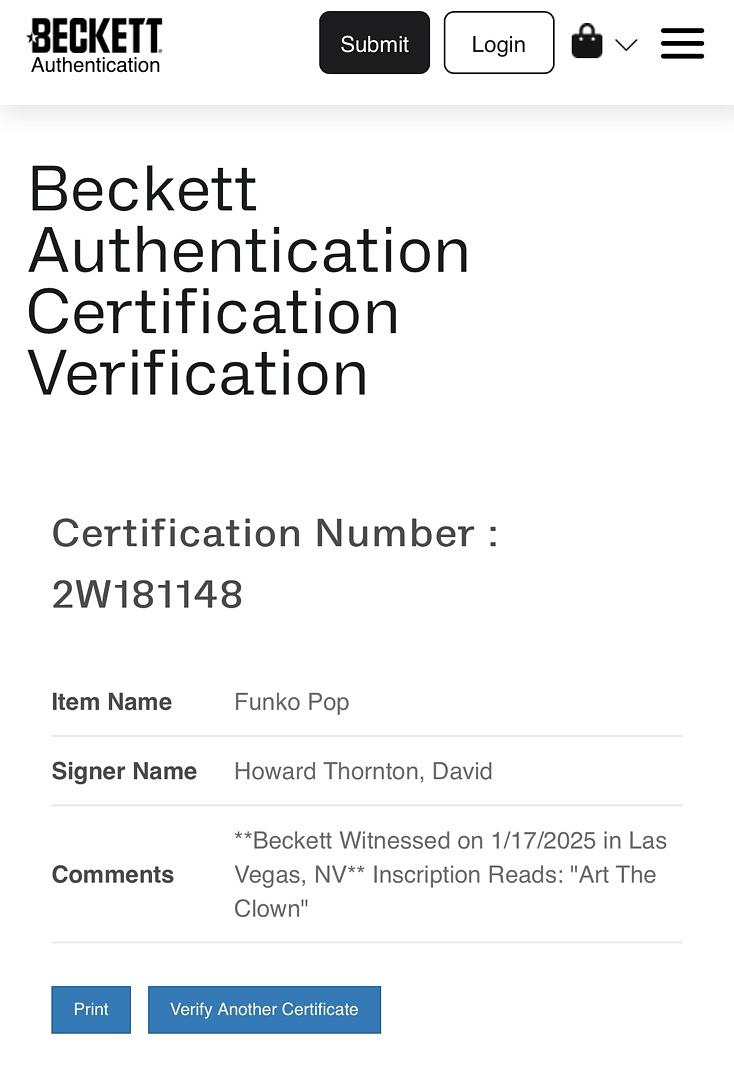 Own a chilling collectible with this David Howard Thornton signed Funko Pop #1590 featuring Art The Clown from Terrifier. Certified authentic by Beckett, this rare autograph pairs a terrifying character with a genuine signature, making it a must-have for horror fans and collectors. Add a unique and exclusive signed Funko Pop to your collection and celebrate the legacy of this iconic horror figure. Don’t miss the chance to own this exceptional memorabilia.