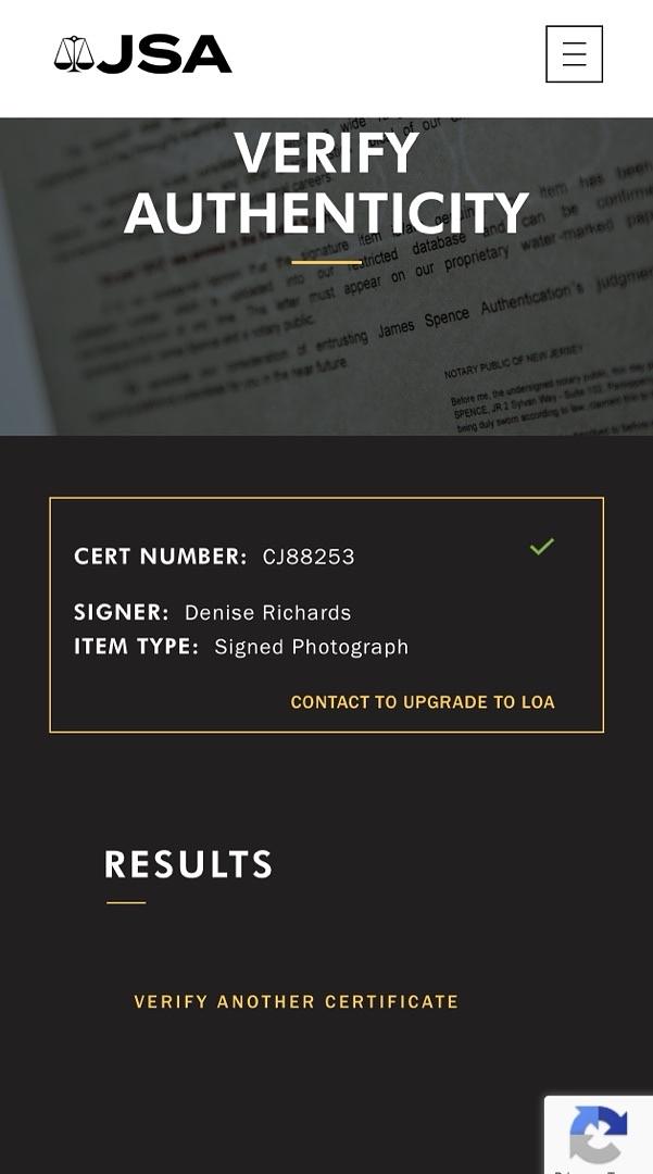 Authentic Denise Richards 8x10 photograph from her iconic Playboy feature, accompanied by JSA Certificate of Authenticity. This collectible captures a memorable moment from entertainment history and makes an exceptional addition to any autograph or celebrity memorabilia collection. The JSA COA guarantees the photo's legitimacy, providing peace of mind for serious collectors. Perfect for fans of 90s pop culture and entertainment memorabilia enthusiasts seeking verified, high-quality pieces.