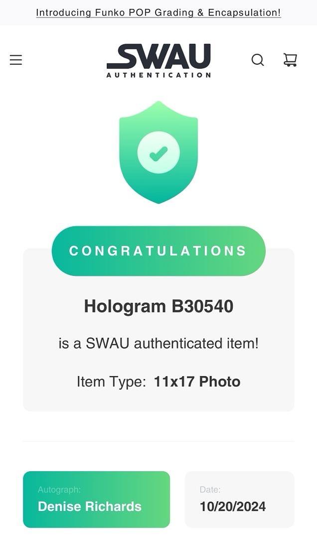 Add a touch of allure to your collection with this 11x14 photo of Denise Richards from Wild Things, personally signed and authenticated by SWAU. Capturing her captivating presence, this collectible is perfect for fans and autograph enthusiasts seeking a genuine piece of Hollywood glamour. Don’t miss the chance to own this striking and authentic memorabilia.