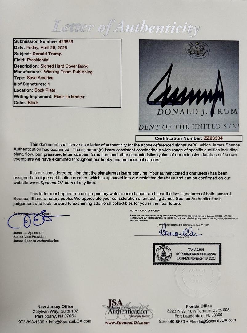 Donald Trump Autographed Save America Book Signed Hardcover. A JSA COA Letter is included. #01