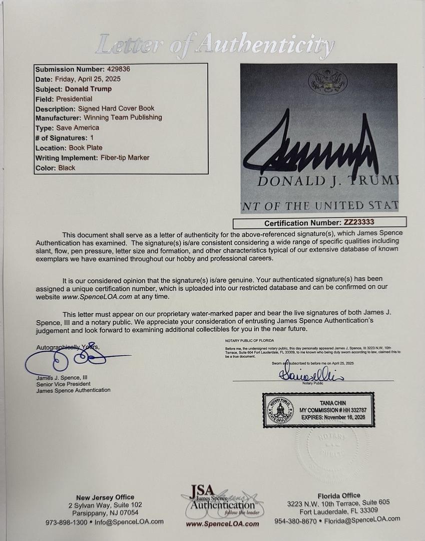 Donald Trump Autographed Save America Book Signed Hardcover. A JSA COA Letter is included. #08