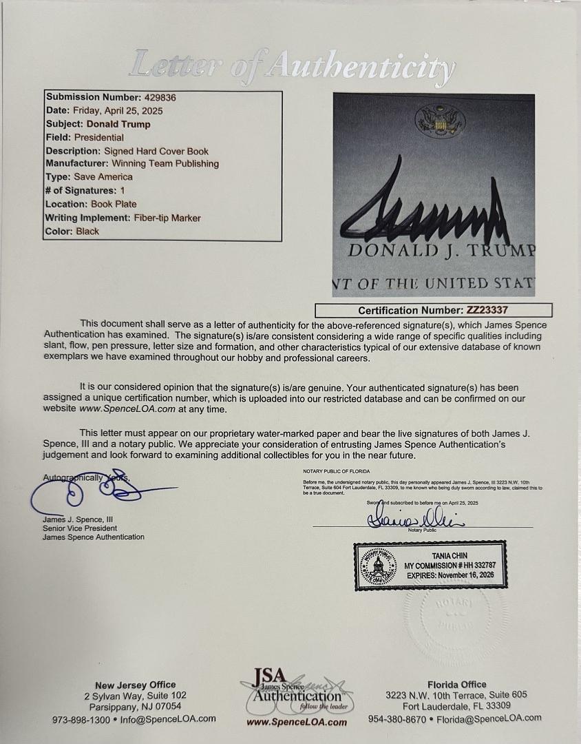 Donald Trump Autographed Save America Book Signed Hardcover. A JSA COA Letter is included. #09