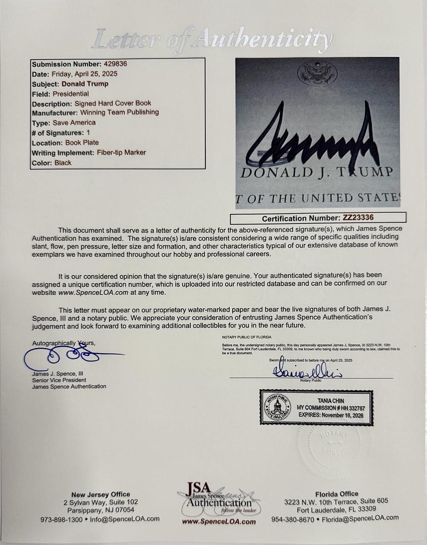 Donald Trump Autographed Save America Book Signed Hardcover. A JSA COA Letter is included #10