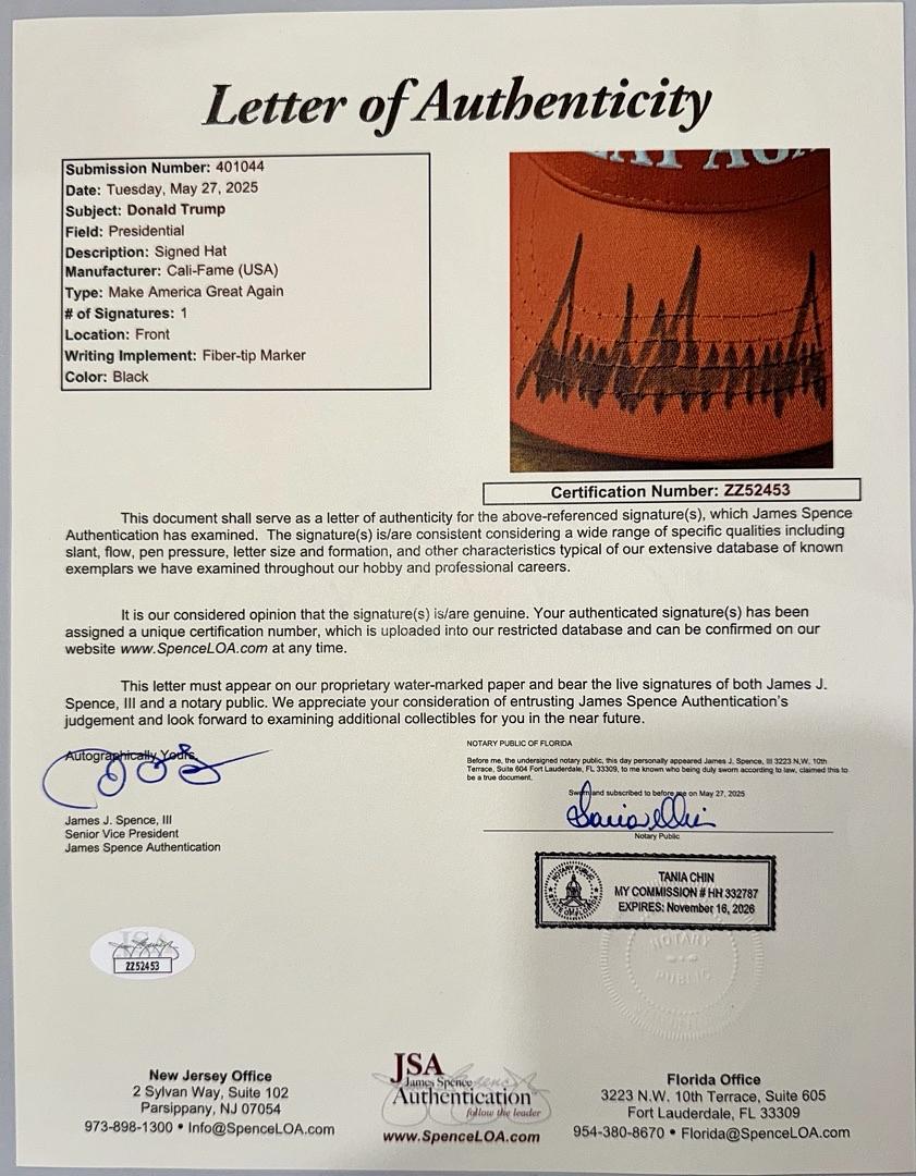 Own a distinctive piece of political history with this Donald Trump signed red MAGA President #45 hat. Authenticated by JSA and accompanied by a full letter of authenticity, this cap is a valuable collectible for supporters and memorabilia enthusiasts. Its verified signature guarantees authenticity and lasting significance, making it an essential addition to any collection. Don’t miss your chance to secure this exclusive and iconic hat today.