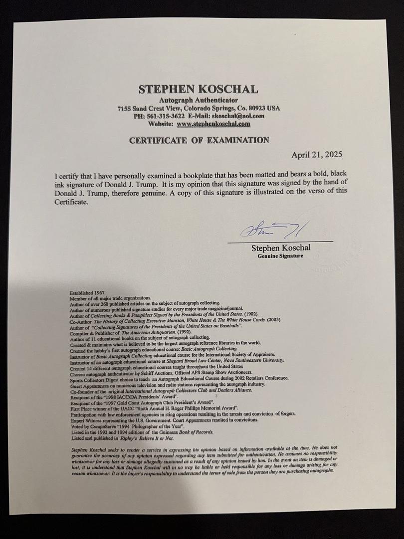 This Donald Trump signed and matted bookplate cut signature is authenticated by longtime UACC authenticator Stephen Koschal, ensuring its authenticity and value. Featuring the most iconic photo of the 45th and 47th President, this collectible also highlights Robert Kiyosaki, making it a distinctive piece for any memorabilia enthusiast. Professionally matted for an impressive display, it’s an exceptional addition to your collection or a thoughtful gift for supporters. Secure this authenticated signature today and own a remarkable piece of presidential history.