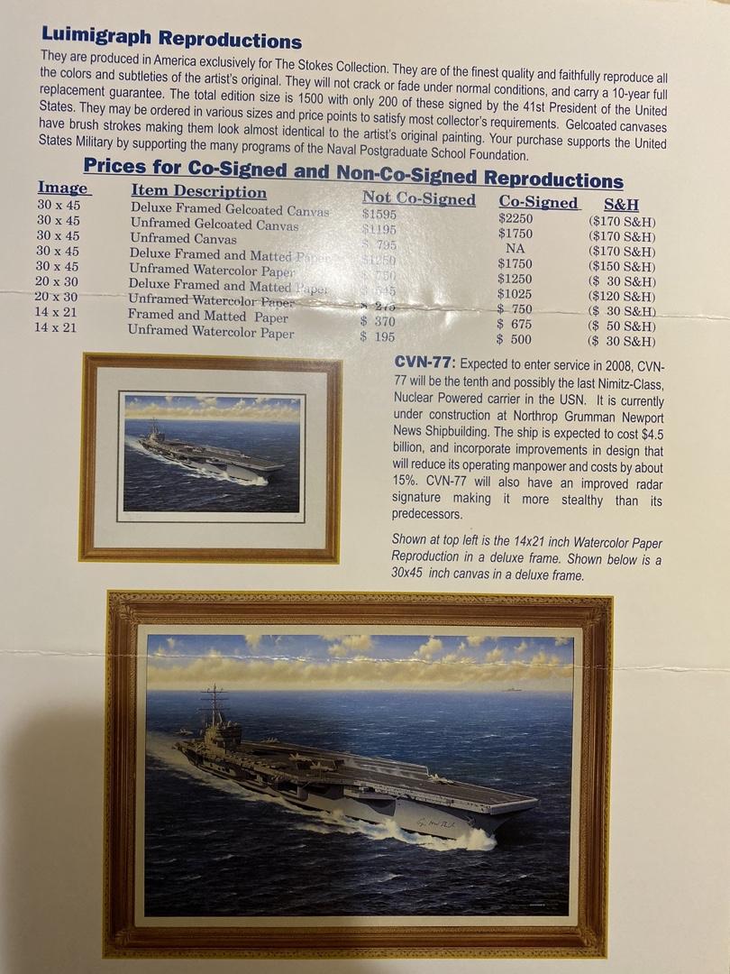 Own a rare piece of history with this signed limited edition 30x20 print by George Bush and Stan Stokes, numbered 46 of 200. Featuring the CVN-77 USS George H.W. Bush, this collectible comes with an R&R Auction Certificate of Authenticity. A must-have for collectors and enthusiasts seeking a unique tribute to a distinguished naval legacy.