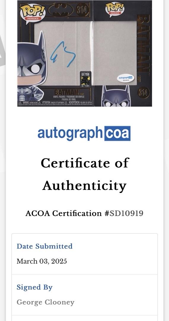 This George Clooney signed Funko Pop #314 Batman features a bold blue ink autograph and comes with an ACOA certificate of authenticity. A rare and highly collectible piece, it offers fans a unique opportunity to own an authentic item connected to the iconic actor and his memorable role as Batman. Perfect for collectors seeking a distinctive and genuine addition to their memorabilia.