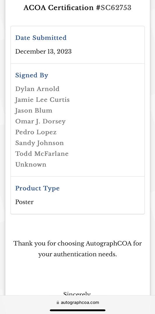 Halloween 12x18 cast Signed Jamie Lee Curtis ACOA