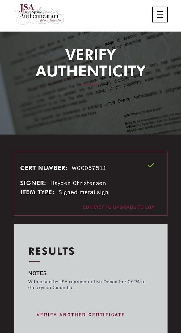 Celebrate your Star Wars fandom with this exclusive 8x12 metal print signed by Hayden Christensen. Featuring a sleek, durable metal surface, this collectible showcases a striking image of the iconic actor, perfect for display. Each piece comes with a JSA Certificate of Authenticity, ensuring the signature's legitimacy and adding value to your collection. Ideal for fans and collectors alike, this signed metal print makes a standout addition to any space.
