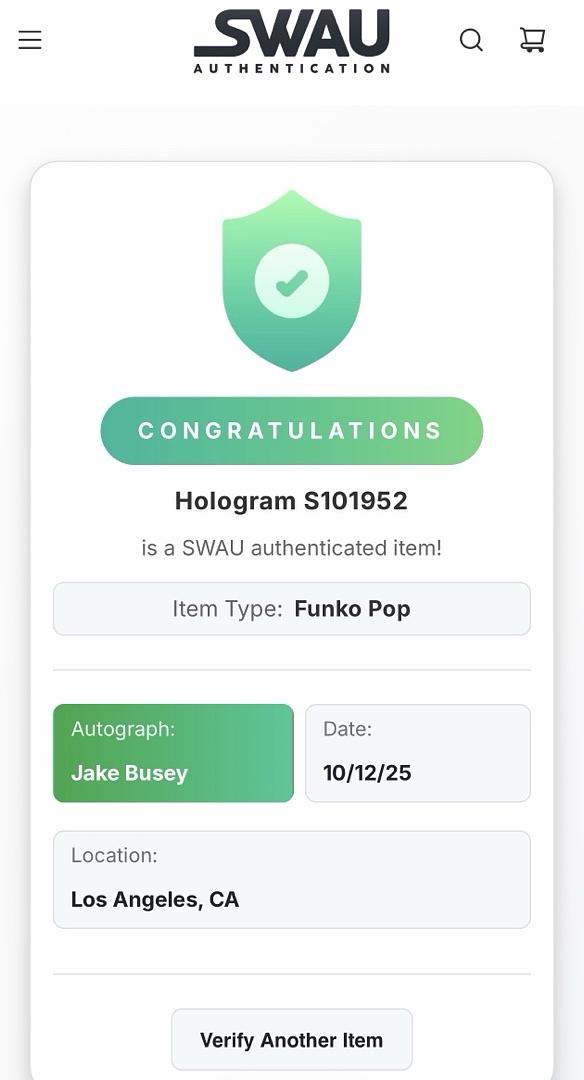 Own a piece of Marvel fandom history with this authenticated Jake Busey-signed Funko Pop featuring Kamala Khan from Ms. Marvel. This collectible #1078 figure captures the beloved character in stunning detail, making it an essential addition for serious Marvel enthusiasts and autograph collectors alike. The included SWAU Certificate of Authenticity guarantees the signature's legitimacy, ensuring your investment holds lasting value. Whether you're displaying it proudly on a shelf or adding to an existing collection, this rare signed Pop combines pop culture appeal with verified provenance that collectors demand.
