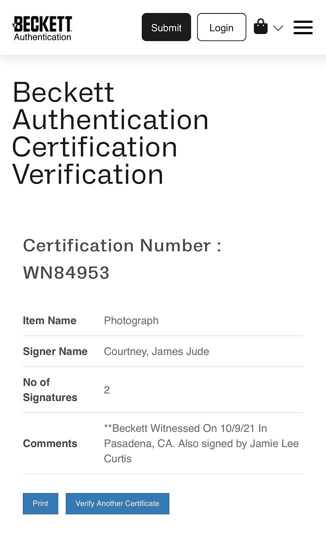Bring the chills and thrills home with this 11x17 photo signed by James Jude Courtney and Jamie Lee Curtis from Halloween! Certified by Beckett, this spooky collectible is perfect for fans who love a good scare and a great autograph. Add a slice of horror legend to your collection and let the Halloween spirit haunt your display year-round!