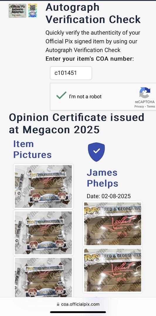 Celebrate the magic of Harry Potter with this Funko Pop featuring Fred and George Weasley, signed by James and Oliver Phelps. Officially authenticated by Official Pix, this collectible offers genuine value and rarity. Perfect for fans and collectors, it’s a unique way to honor the beloved Weasley twins and add a touch of wizarding charm to your collection. Don’t miss the chance to own this exclusive signed Funko Pop.