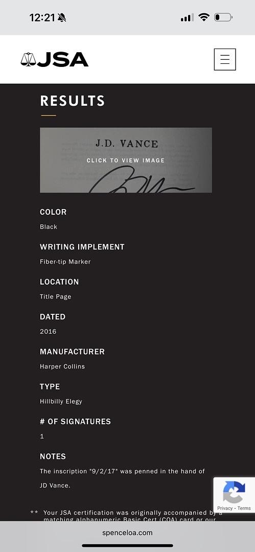 JD Vance (Vice-President) Signed "Hillbilly Elegy" Book #02