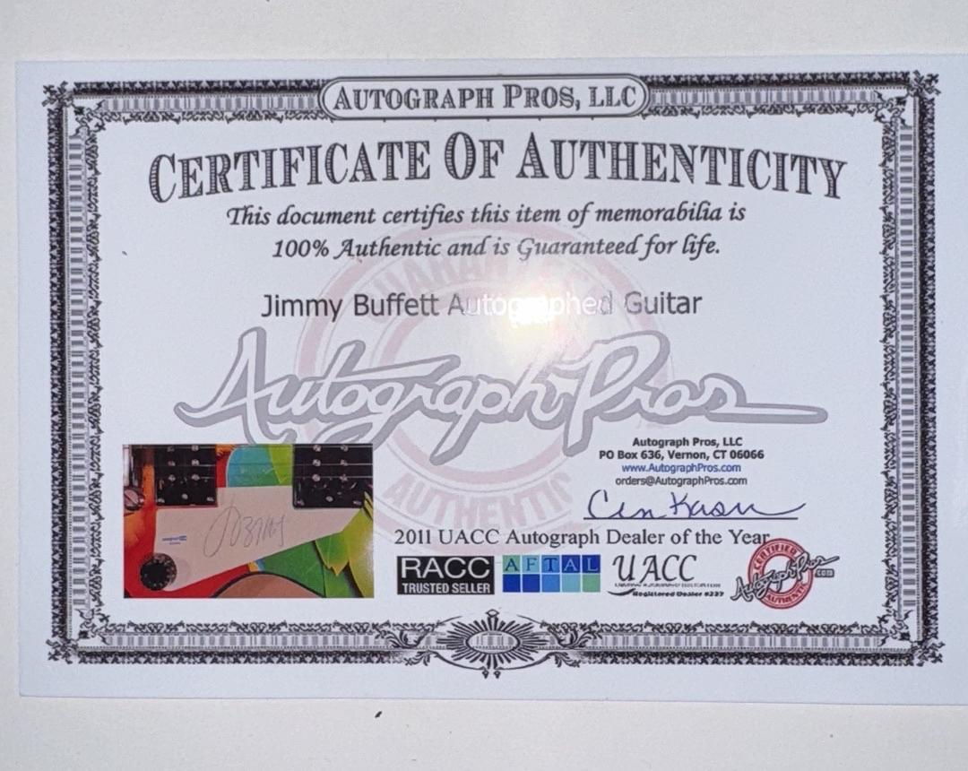 Bring a splash of island vibes to your collection with this guitar signed by Jimmy Buffett! Certified authentic with ACOA, this playful collectible captures the fun and laid-back spirit of Buffett’s music. Perfect for fans who want to own a piece of tropical rock history and add some sunshine to their memorabilia!  Perfect for the Parrothead in your life!!