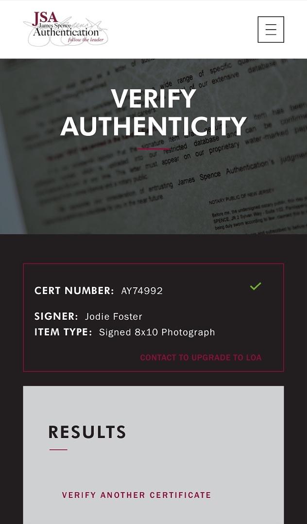 Enhance your collection with this authentic 8x10 photo signed by acclaimed actress Jodie Foster. Certified by JSA, this collectible offers verified authenticity and timeless appeal. A must-have for serious fans and collectors, it’s a distinguished addition that celebrates one of Hollywood’s most respected talents. Don’t miss the opportunity to own this exceptional piece.
