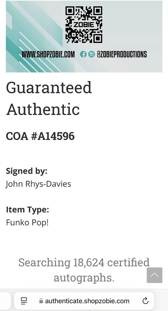 Add a treasured piece to your Indiana Jones collection with this John Rhys-Davies signed Funko Pop #1352 featuring Sallah. Certified authentic by Zobie from their private signing, this collectible guarantees a genuine autograph, making it a must-have for fans and collectors seeking a unique and verified tribute to this beloved character.