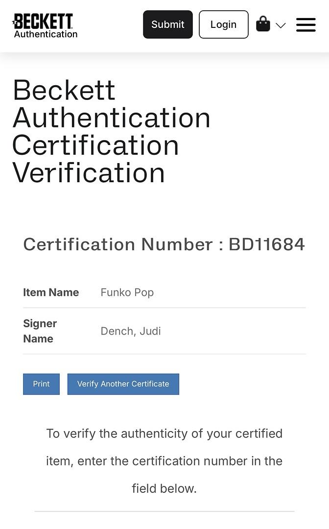 Celebrate the iconic role of M in James Bond 007 Goldeneye with this Judi Dench signed Funko Pop #800. Certified authentic by Beckett, this collectible guarantees a genuine autograph, making it a must-have for fans and collectors seeking a unique and verified tribute to this legendary character.