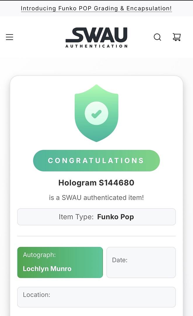 This exclusive Lochlyn Munro signed "Fugitive Predator" Funko #620 is a must-have for dedicated collectors and fans alike. Featuring an eye-catching autograph authenticated by a SWAU Certificate of Authenticity, this unique piece captures the essence of the iconic Predator franchise. Add a rare and valuable collectible to your display that stands out for both its signature and limited edition status. Secure this Funko today and own a piece of pop culture history verified for authenticity and appeal.