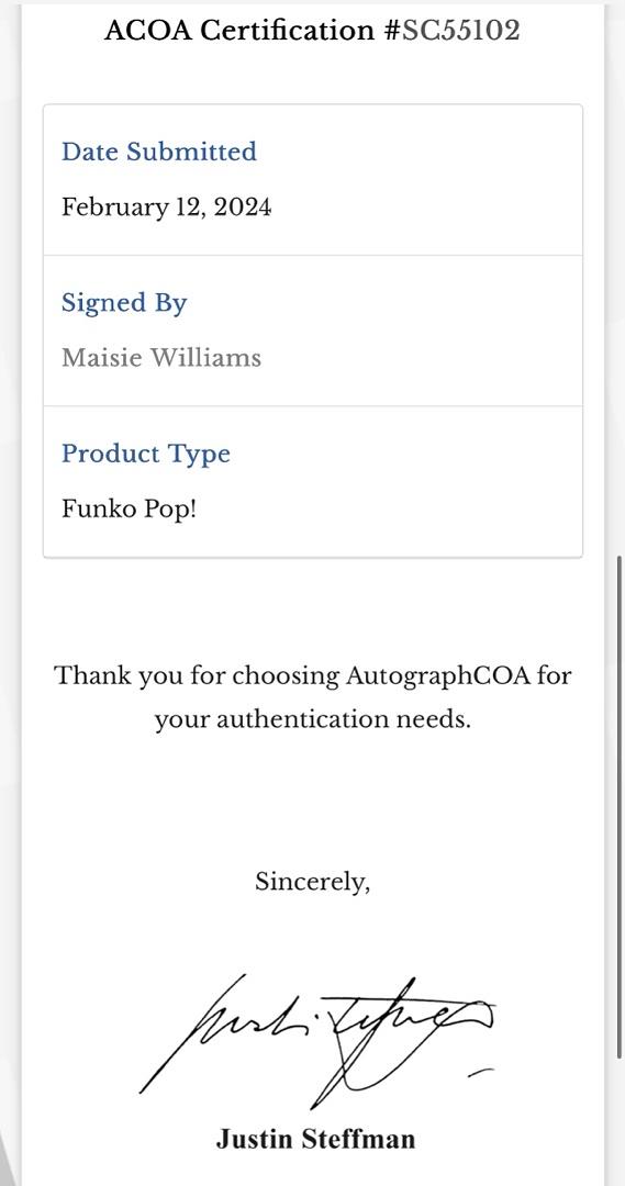 Own a truly rare collectible with this Maisie Williams signed Funko Pop #79 Arya Stark from Game of Thrones, authenticated by RACC ACOA. This exclusive autograph is a must-have for dedicated fans and collectors seeking a unique piece that celebrates one of the series’ most iconic characters. Don’t miss the opportunity to add this exceptional signed Funko Pop to your collection.