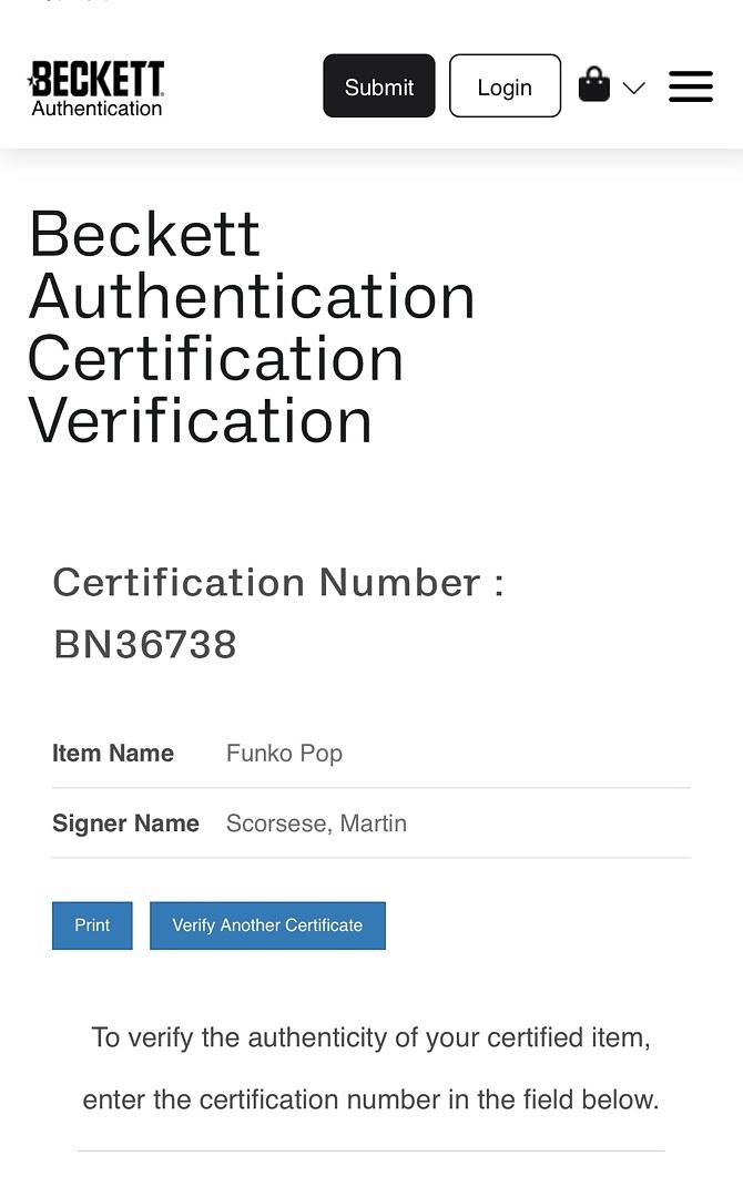 Celebrate cinematic history with this Martin Scorsese signed Funko Pop #1862 "Sam Rothstein" from Casino. Authenticated by Beckett with a Certificate of Authenticity, this collectible features a genuine autograph from the legendary filmmaker. Perfect for fans and collectors, it’s a rare and valuable piece that honors a true Hollywood icon. Don’t miss your chance to own this exclusive and authenticated treasure.
