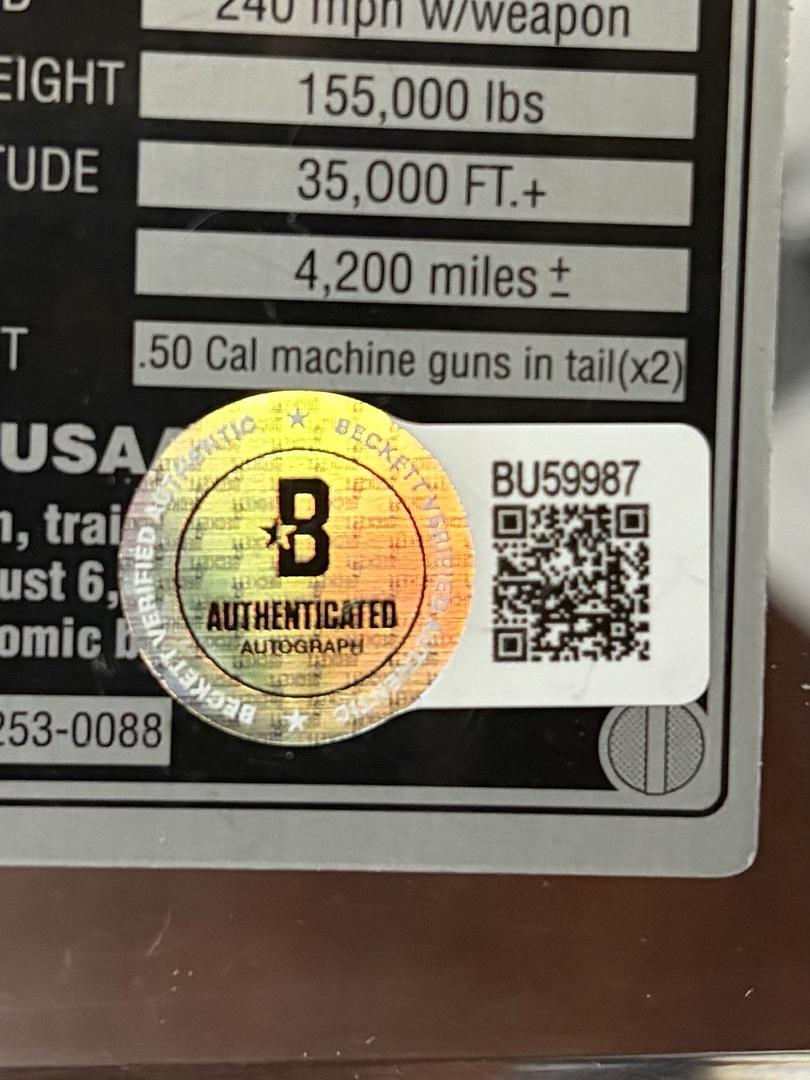 Own a piece of aviation history with this exceptional Paul Tibbets signed lucite block. One side features an authenticated photograph personally signed by Tibbets himself, while the reverse displays detailed Enola Gay specifications—a tribute to the legendary B-29 bomber. Backed by a Beckett Certificate of Authenticity, this rare collectible combines historical significance with museum-quality presentation. An essential addition for serious aviation and WWII memorabilia collectors.