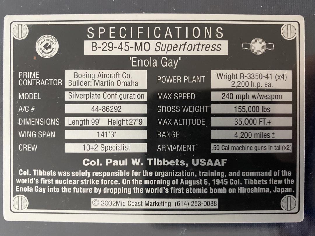 Paul Tibbets signed lucite block with signed picture on one side and Enola Gay Specifications on the verso - Beckett COA *RARE*