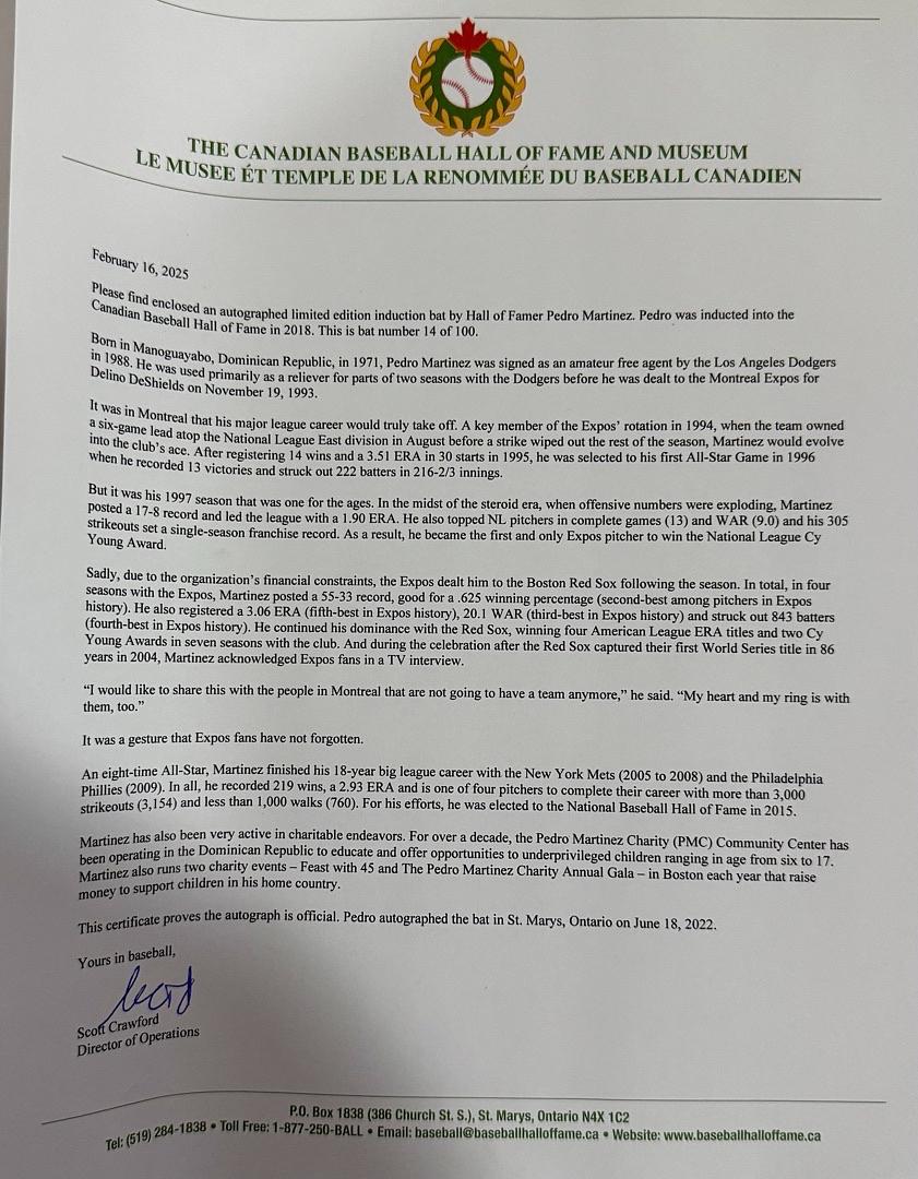 Pedro Martinez Autographed this Limited Edition Blonde Canadian Baseball HOF Bat w/Inscription #14/100