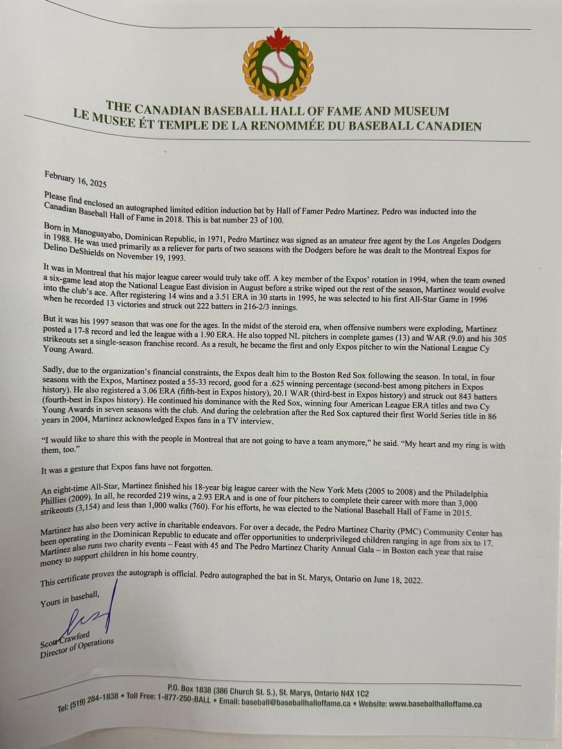Own a rare and exclusive collectible with this Pedro Martinez autographed Limited Edition Blonde Canadian Baseball Hall of Fame bat, numbered #23 of only 100. Featuring a special inscription, this very rare bat honors Martinez’s legendary career and Hall of Fame status. Perfect for serious collectors and baseball enthusiasts, this authenticated piece is a valuable keepsake celebrating one of the sport’s greatest pitchers. Secure this limited edition treasure today.