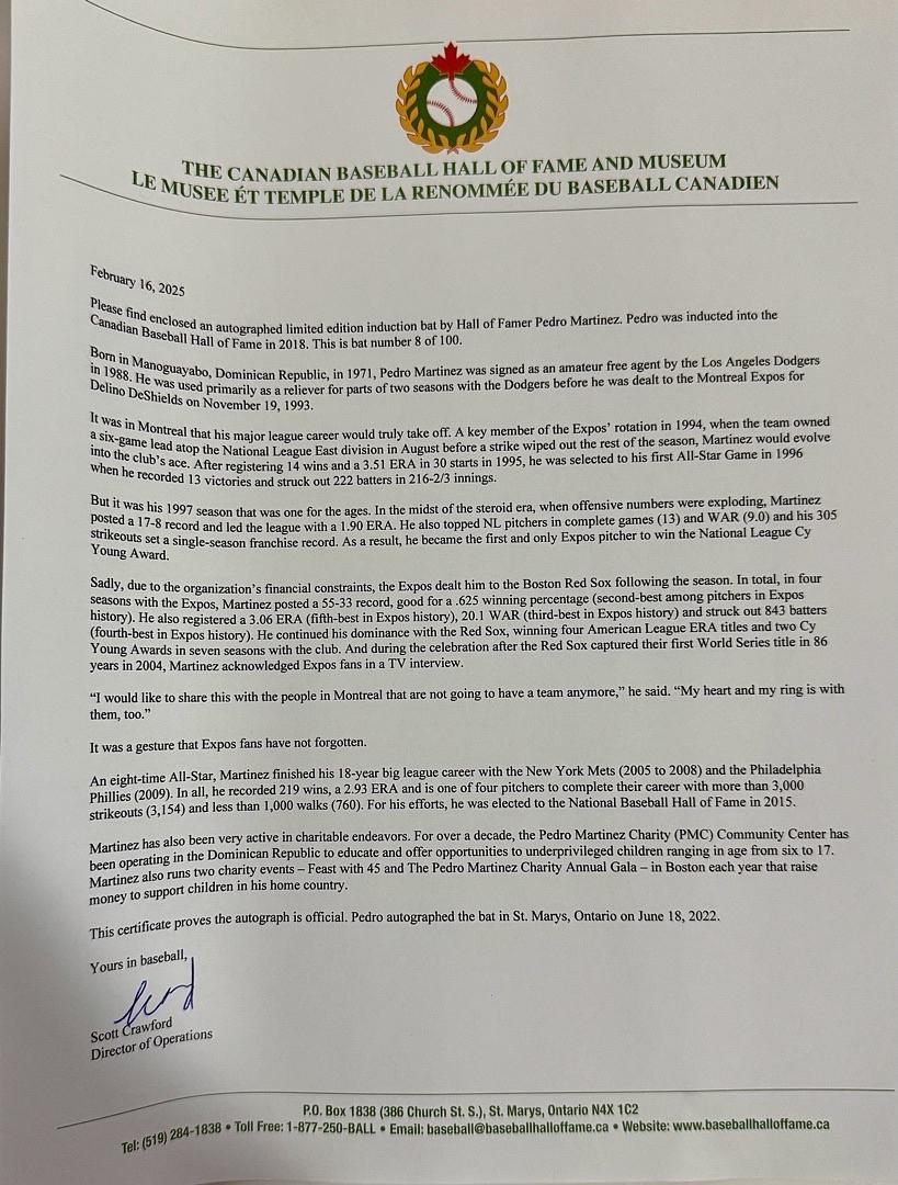 Own an exceptionally rare collectible with this Pedro Martinez autographed Limited Edition Blonde Canadian Baseball Hall of Fame bat, numbered #8 of only 100. Featuring a special inscription, this exclusive bat celebrates Martinez’s legendary career and Hall of Fame status. Perfect for serious collectors and baseball enthusiasts, this authenticated piece is a valuable keepsake that honors one of the sport’s greatest pitchers. Secure this very rare edition today.