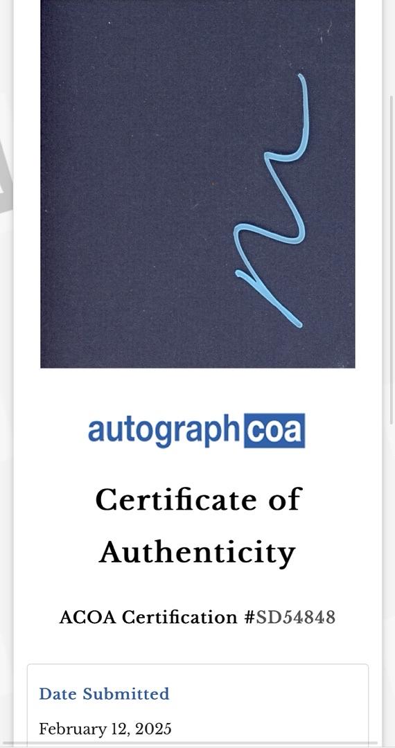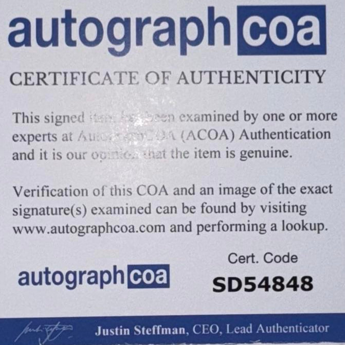 Add a vibrant touch to your Marvel collection with this Ryan Reynolds signed Funko Pop #1345 Tourist Deadpool in blue ink. Authenticated by ACOA, this collectible features a genuine autograph that captures the playful spirit of Deadpool, making it a must-have for fans and collectors alike. Don’t miss the chance to own this unique piece of superhero memorabilia.