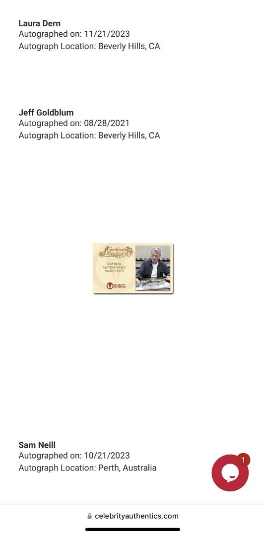 Sam Neill Laura Dern Jeff Goldblum signed 16x20 - Celebrity Authentics