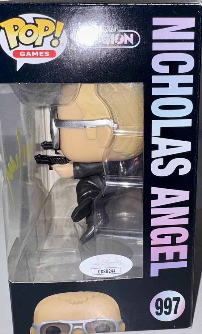 Enhance your collection with this Simon Pegg signed Funko Pop #997 featuring Nicholas Angel from Hot Fuzz. Authenticated by a JSA Certificate of Authenticity, this collectible offers verified signature authenticity and a connection to the iconic character. Perfect for fans and collectors, it’s a standout addition that celebrates a beloved film with lasting value.