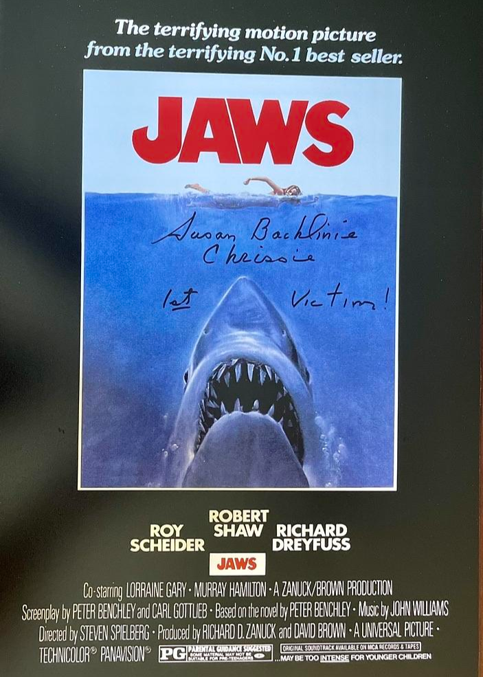 Make waves with this playful 11x17 photo of Susan Backlinie from Jaws, signed and certified by Capital City COA. Celebrating the 50th anniversary and her role as Chrissie, the first victim, this autograph adds a splash of fun and film history to any collection. Don’t miss your chance to reel in this unique collectible!