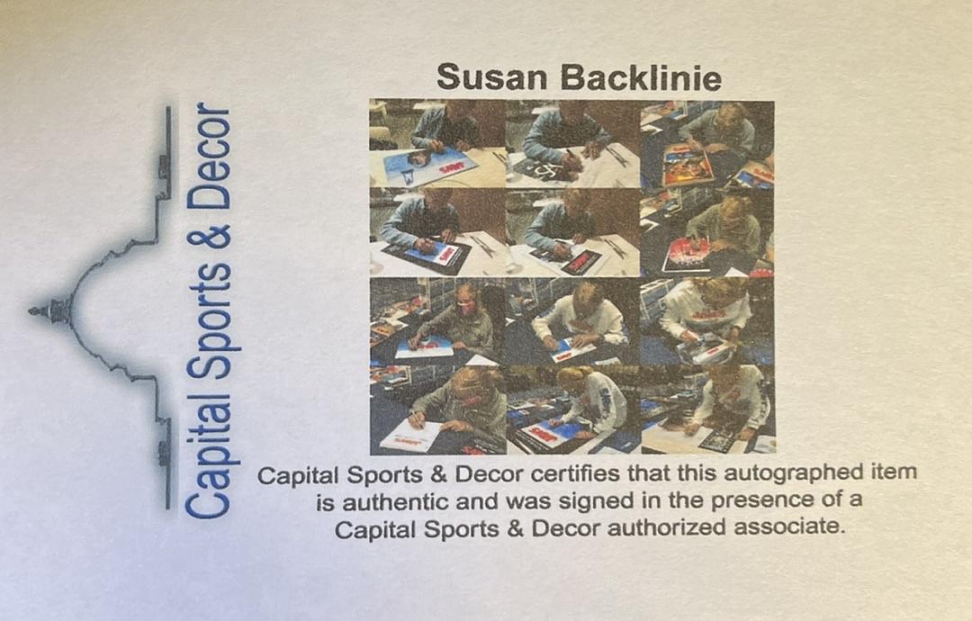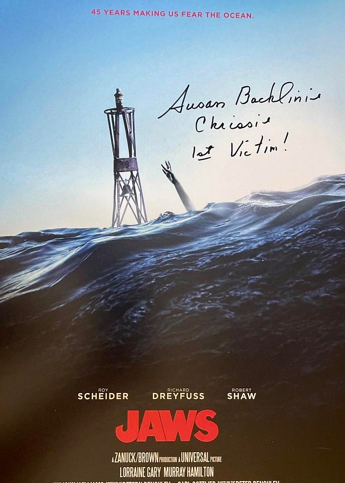 Dive into nostalgia with this playful 11x17 photo of Susan Backlinie from Jaws, signed and certified by Capital City COA. Featuring fun inscriptions marking her iconic role as Chrissie, the first victim, this collectible is a must-have for fans who love a splash of movie history. Celebrate the 50th anniversary of the release of the movie!! Don’t let this one swim away—add it to your collection today!