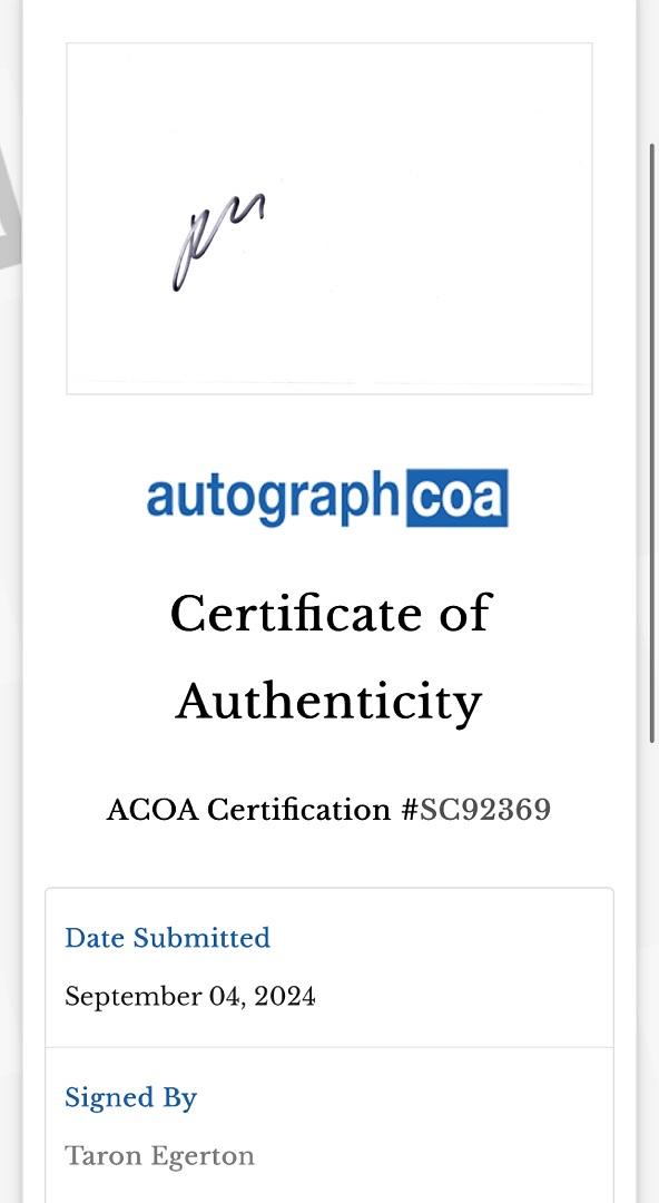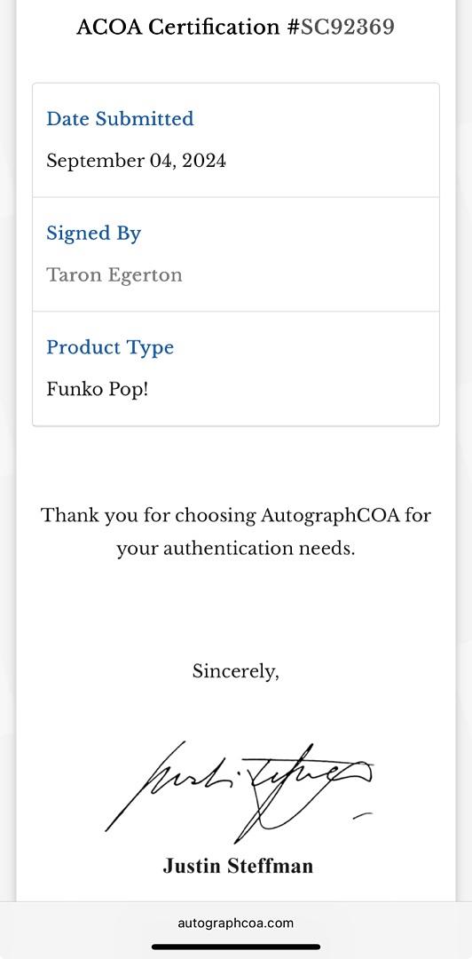 Elevate your Kingsman collection with this Taron Egerton signed Funko Pop #463 featuring Eggsy, authenticated by ACOA. This genuine autograph is a must-have for fans and collectors seeking an exclusive piece celebrating the iconic character. Don’t miss the chance to own this authentic signed collectible and enhance your memorabilia.